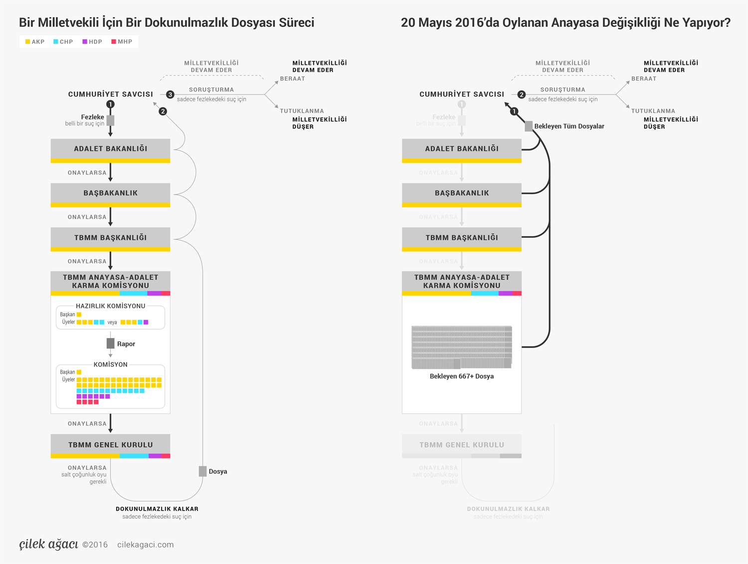 Anayasa’nın 83. Maddesi gereği, hakkında dokunulmazlık dosyası bulunan milletvekillerinin dokunulmazlığının kaldırılması ancak Meclis kararı ile gerçekleşebiliyor. Normal süreçte bir vekil hakkındaki her dosya için ayrı bir Meclis oylaması yapılması gerekiyor. (Bir fezlekenin Meclis’e gelmesi ve oylamadan geçerse yargıya dönmesi sürecini yukarıdaki şekilde görselleştirdik.) Buna göre komisyonda bekleyen 667 dosya için ayrı ayrı görüşmelerin ve oylamaların yapılması gerekli. 20 Mayıs’ta Meclis’in kabul ettiği yasa değişikliği ile komisyonda, Adalet Bakanlığı’nda ve Başbakanlık’ta halihazırda bekleyen 667’den fazla dokunulmazlık dosyası için bu süreç işlemez hâle getirildi ve hakkında dosya olan vekillerin o dosyalar için yargılanmasının önü açıldı. Yasa değişikliğinin en can alıcı özelliği bundan sonra Meclis’e gelecek yeni fezlekeleri etkilemeyecek olması. Komisyona (ve Adalet Bakanlığı gibi süreçte yer alan diğer kurumlara) ulaşmış dosyalar haricinde milletvekili dokunulmazlarının kalıcı olarak sınırlanması ya da değiştirilmesi söz konusu değil. (20 Mayıs değişikliğinin tam olarak ne yaptığını da aynı görsel sistem üzerinden aşağıda inceleyebilirsiniz. İkisini yan yana görmek isterseniz şuraya bakabilirsiniz.)