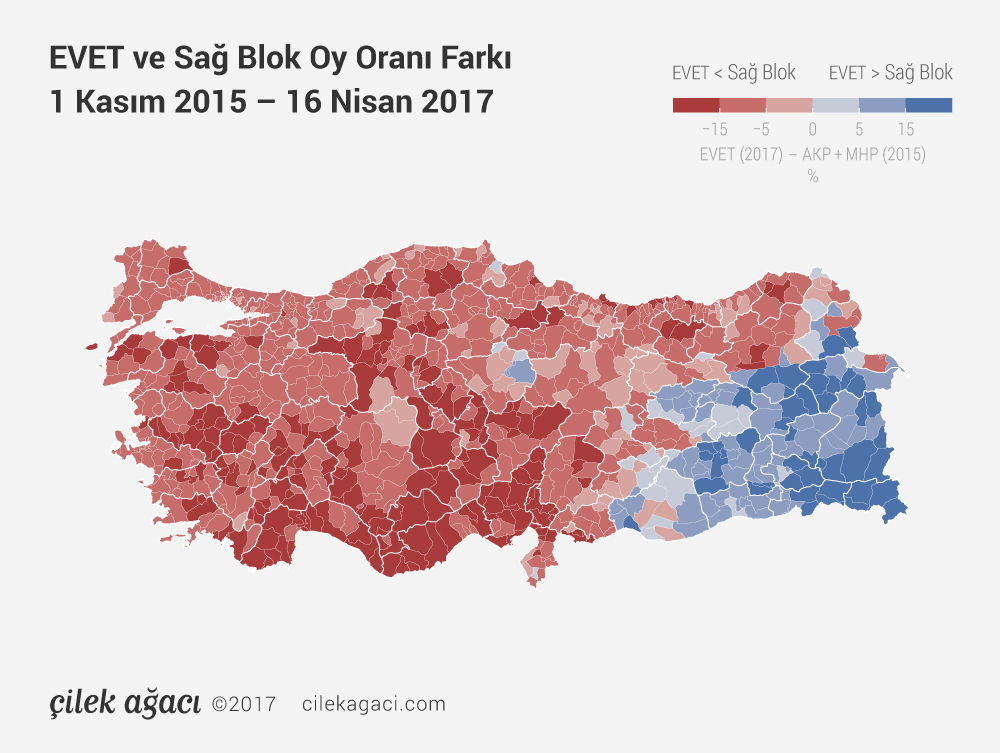 Halk oylamasında EVET oy oranı Orta ve Batı Anadolu’daki neredeyse her ilçede AK Parti ve MHP toplam oy oranının 5 puan altında kaldı. Bu fark, Akdeniz Bölgesi’nde 10–15 puan seviyelerine çıktı.