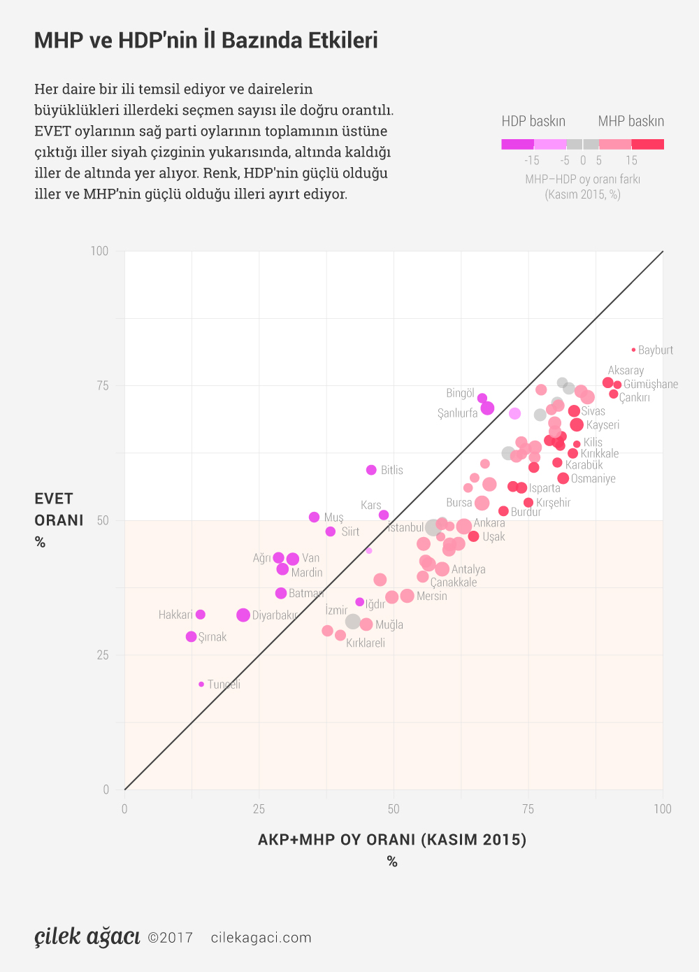 Doğu ve Güneydoğu Anadolu bölgelerinde durum tam tersi. EVET oylarının oranı neredeyse her ilçede AKP ve MHP oy oranlarının toplamının üstünde. Buna göre HDP seçmeni içerisinde HAYIR oyu vermeyen bir azınlık halk oylaması sonuçlarını belirleyici bir biçimde etkiledi.